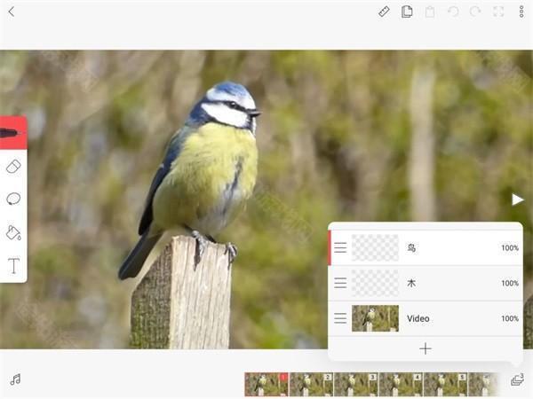 点击右侧的图层图标,能看到里面包含视频图层;我们可以把视频上方的空白图层命名为“树”,接着新建一个图层并命名为“鸟”,拖动图层还能调整其上下位置。