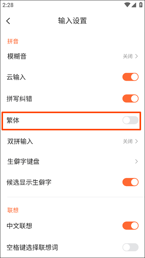 3、然后,在输入设置当中点,亮繁体选项即可开启繁体输入了。