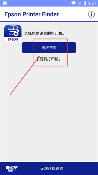 2、进入选择界面后,若显示“未找到打印机”,可点击界面中的【再次搜索】按钮,尝试重新查找设备。