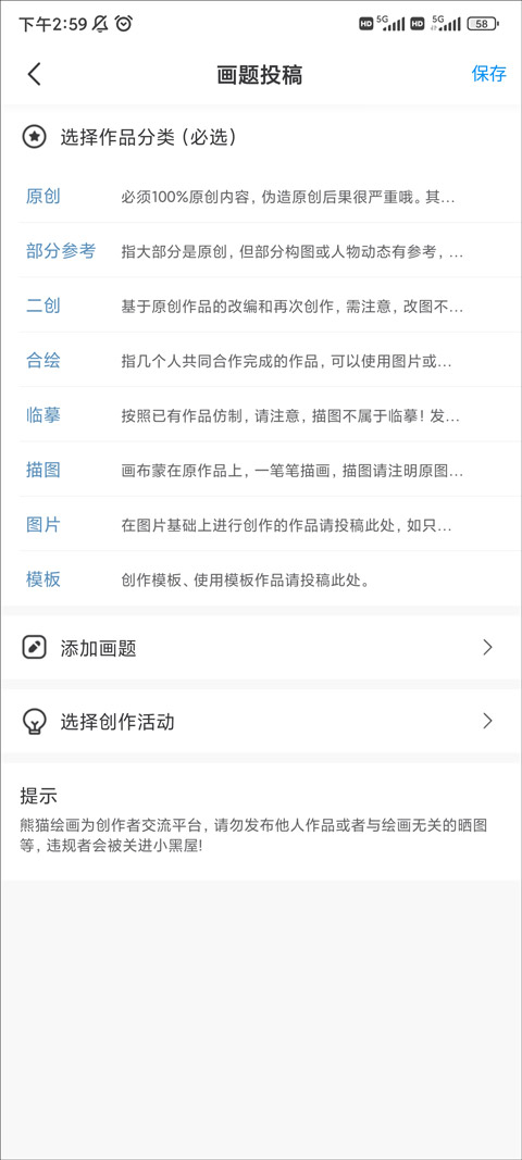 4、点击“画题投稿”选项,在此页面中,你能够对作品分类进行选择、添加画题内容、挑选对应的创作活动等,完成操作后点击保存即可。