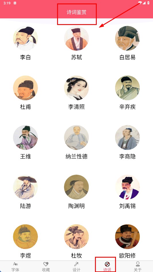 4、点击底部的【诗词】功能按钮,进入诗词鉴赏页面后,能够选择李白、苏轼等诗人,开展诗词鉴赏活动。