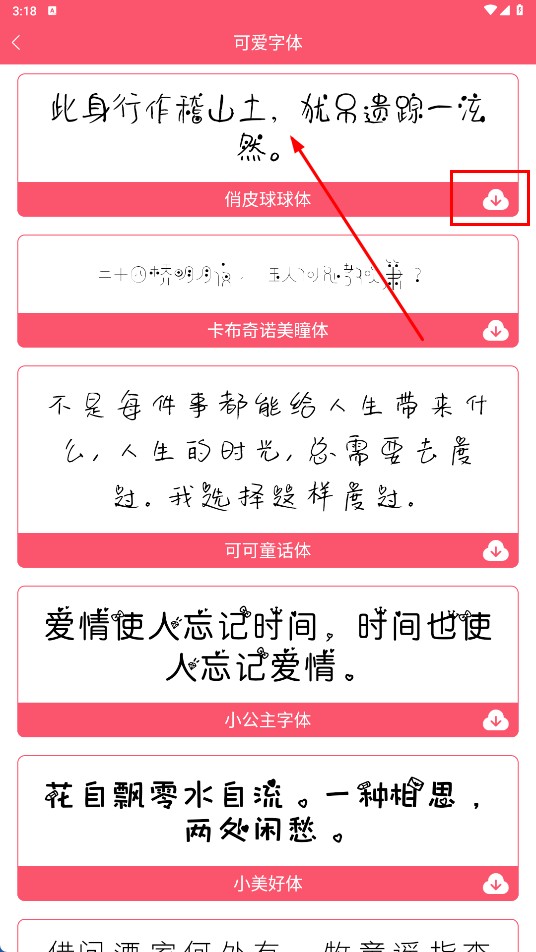 1、在首页能够选择不同风格的字体分类,比如点击【俏皮可爱的字体-分类标签】,即可进入可爱字体页面。