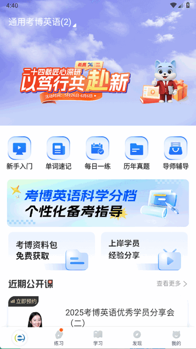 考博英语题库是专为备考博士英语的小伙伴们打造的全能帮手,无论你处于打基础阶段还是冲刺高分阶段,它都能提供助力。该题库收录了多所高校的真题与模拟题,题型丰富全面,更新也十分及时,日常训练、专项突破、章节练习等功能都规划得清晰合理。通过它你还能获取超详细的做题报告,清晰了解自身薄弱环节以及对应的提升方向,大幅提升学习效率。此外,考博英语题库还配备了词汇、听力、语法、翻译、写作等全套视频课程,支持调节语速和离线学习,即便在地铁上也能随时听学。