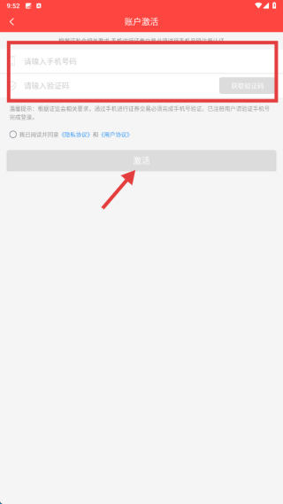 4、在账户激活页面,输入手机号码和验证码,点击激活按钮,后续按提示完成交易密码修改操作。
