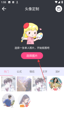 3、进入头像定制页面后,点击选择图片按钮,挑选一张单人照片。