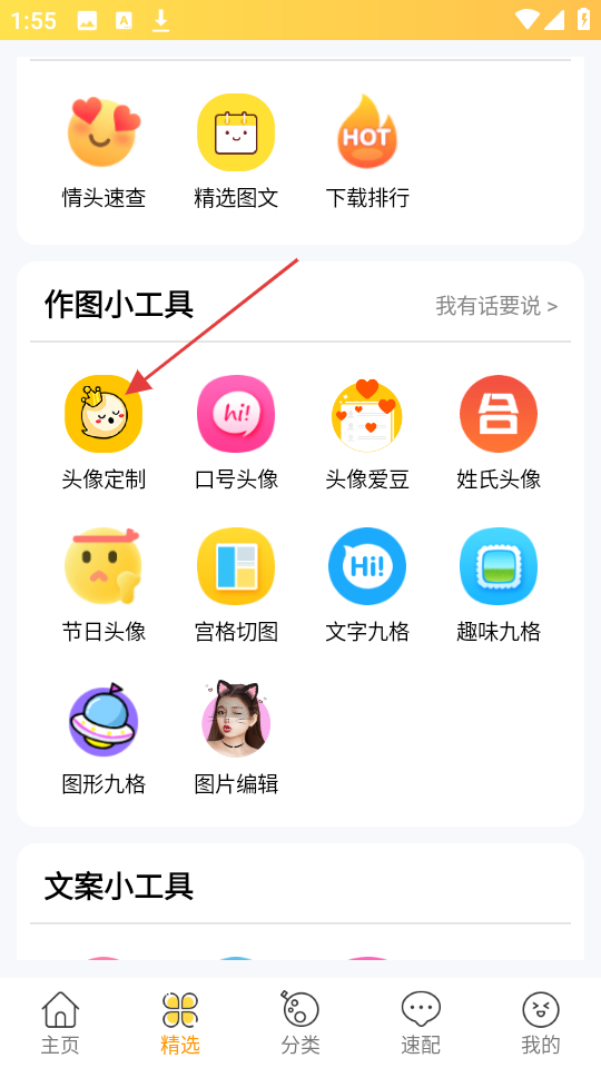 2、在精选页面的作图小工具区域,点击头像定制选项。