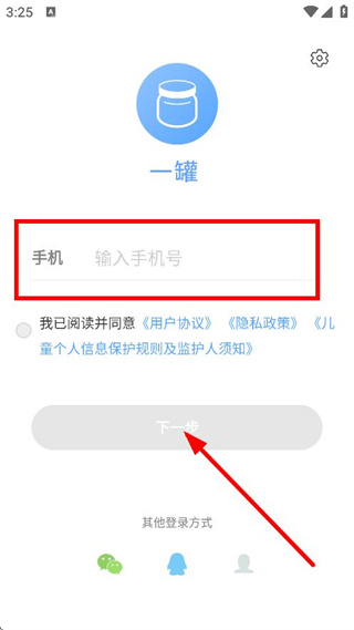 2、在登录注册页面,输入手机号,勾选同意后点击下一步。