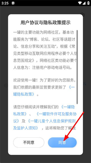 1、在用户协议与隐私政策提示弹窗中,点击同意,进入页面。