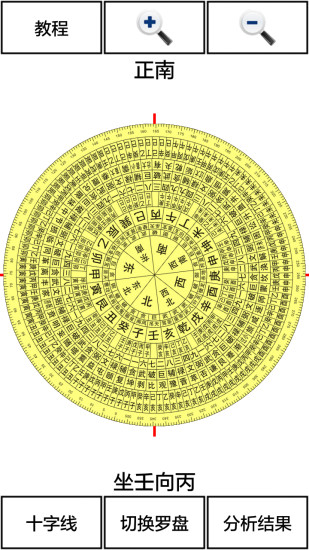 1、打开罗盘,使其对准房屋大门,随后点击“分析”按钮即可进行风水测算。系统会自动生成房间各个方位的布局详情。
