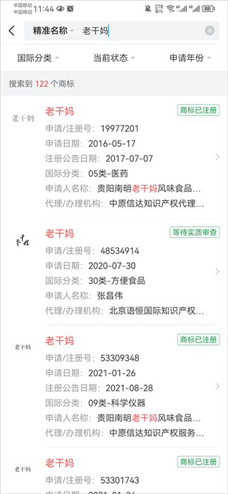 3、等搜索结果呈现后,就能查看该商标的注册信息了