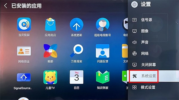 2、按下遥控器的设置按键,或者在【应用】页面的已安装应用列表中找到并打开设置,然后进入【系统设置】