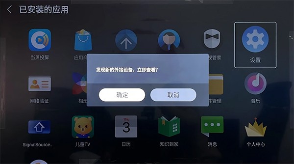 4、成功开启后,把U盘插入电视,屏幕会弹出提示发现外接设备的窗口,选择【确定】按钮即可进入查看内容