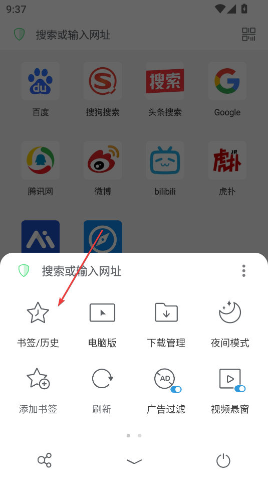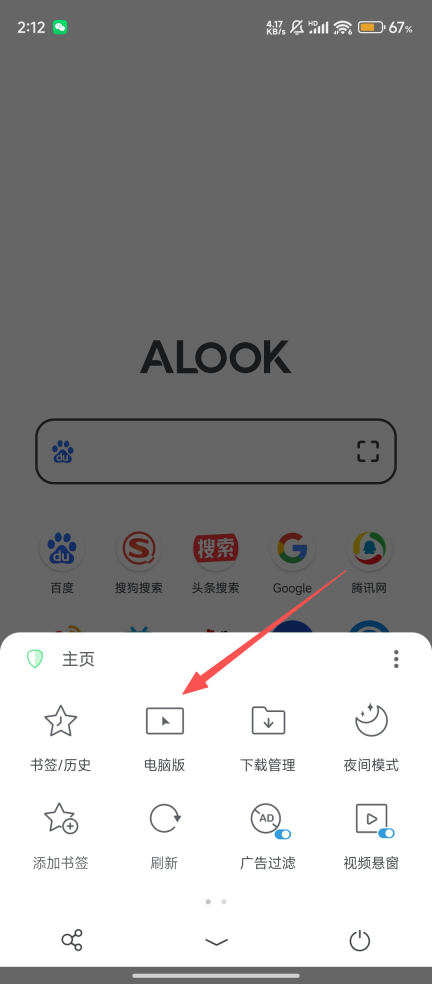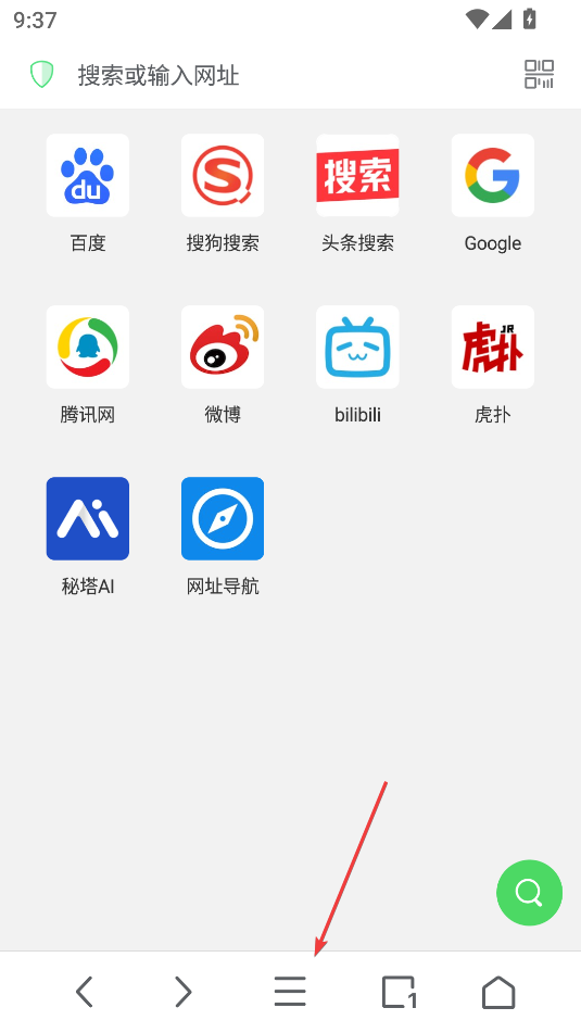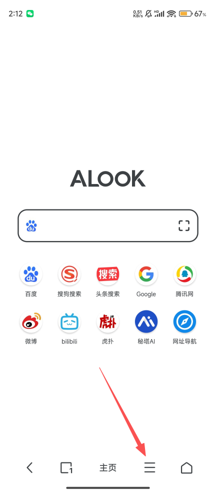 1、打开Alook浏览器后,点击底部的三条横线菜单按钮,展开功能选项。