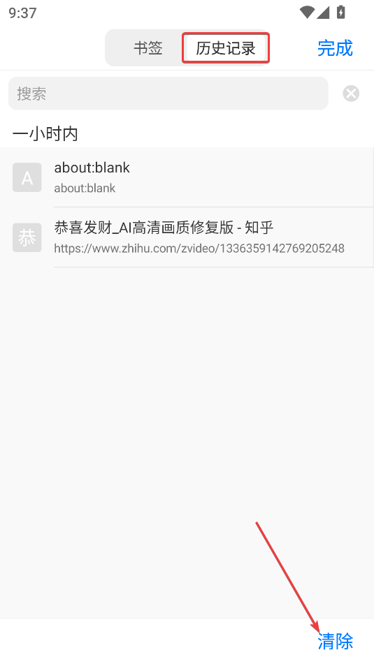 3、在上方找到并点击历史记录选项,接着点击右下角的清除按钮,根据时间范围来删除对应的历史记录