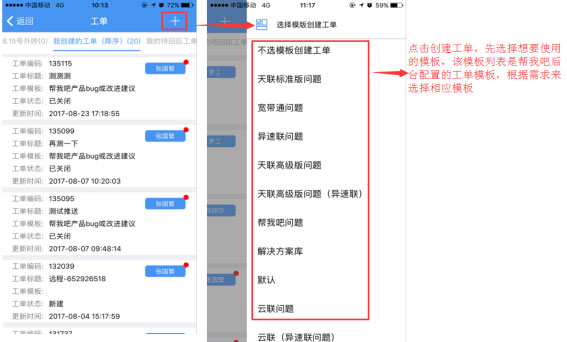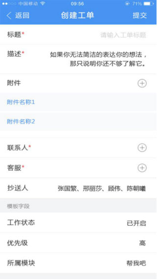 帮呀支持创建工单,操作流程是先挑选模板,接着填写工单的相关信息,像工单标题、描述、联系人、客服、抄送人、回复信息、附件以及工单模板对应的相关字段,提交之后这个工单就能派发出去了。