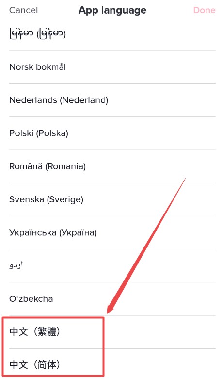 5、在语言列表中一直拉到底部,可以看到【繁体中文】和【简体中文】。
