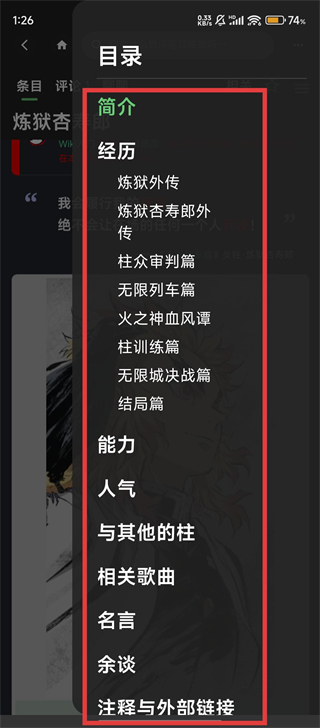 4、在目录列表里,挑选【简介】【经历】这类分类,就能快速跳转到对应的内容部分,方便大家轻松查看详细信息。