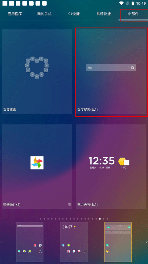 3、除了添加图标外,还能添加小部件,操作方法是先选中想要添加的小部件,然后点击要添加到的屏幕主界面就可以了。