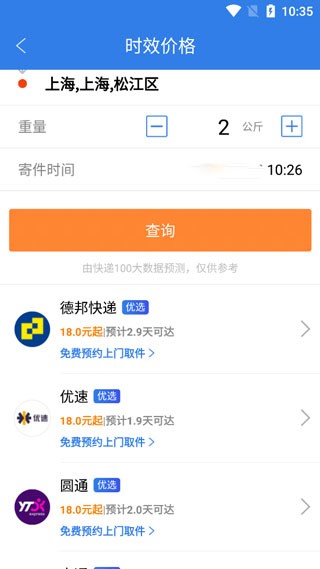 4.人性化服务体验:支持预约快递上门取件,一键即可快速满足寄件需求;同时提供寄件费用预估功能,助力用户合理规划寄件成本。
