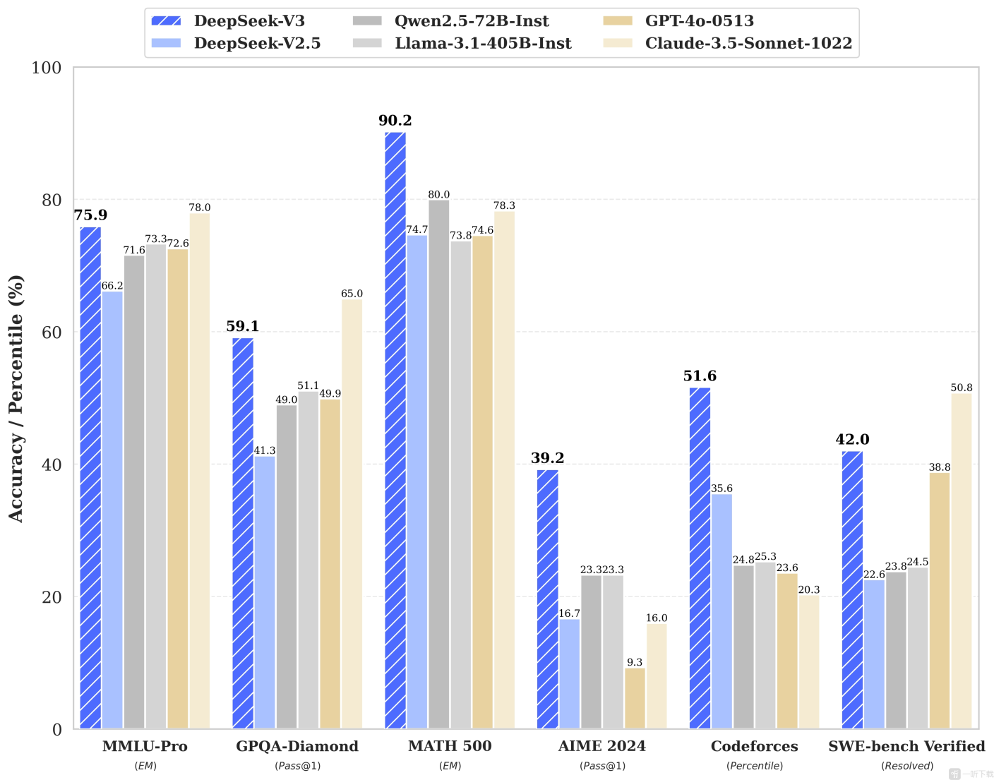 在人工智能领域,模型的性能与能力始终是评判其价值的关键指标。近期,DeepSeek-V3 在多项测评中展现出卓越表现,不仅超越了 Qwen2.5-72B、Llama-3.1-405B 等其他开源模型,还与全球顶尖的闭源模型 GPT-4o、Claude-3.5-Sonnet 达到了不相伯仲的水平。以下是对应的能力对比图: