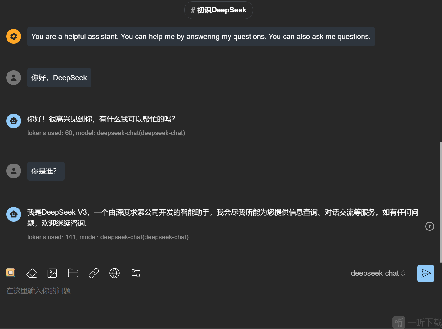 在 Chatbox 中输入测试问题,如“你好,DeepSeek”。