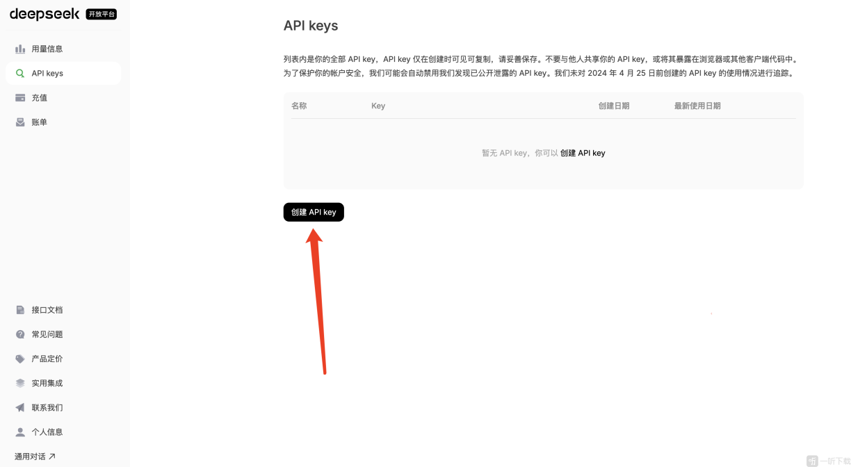 3、登录后,进入左侧的API Keys页面,点击创建 API Key。