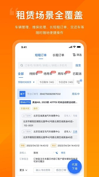 2租赁服务覆盖车辆管理、维保处理以及长短租订单的交车还车等场景,用户可随时随地方便地进行操作。
