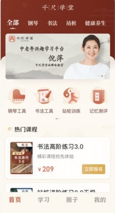 由北京世纪万合信息咨询有限公司打造的千尺学堂,是一个功能丰富的在线学习平台。平台汇聚了书法、钢琴等多种课程,海量优质教学资源可供用户使用,助力大家提升自我。用户可根据自身需求挑选合适的课程报名,专业名师在线辅导,让学习过程轻松高效。该平台以专业知识为核心,融合“知识深度与兴趣广度”,倡导终身学习理念,专注探索中老年兴趣学习的创新模式,通过打磨专业内容与贴心服务,帮助中老年人拓展人生边界,实现更多可能。感兴趣的朋友不妨体验一番!