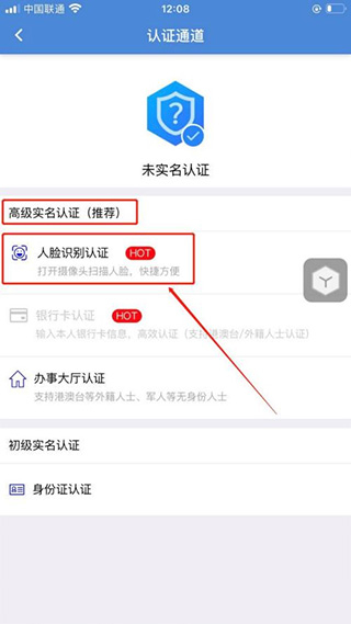 3、选择“高级实名认证”选项,按照系统给出的提示完成整个认证流程。需要注意的是,只有完成了高级实名认证这一步骤,才能够办理政府事务的线上申请等相关业务。