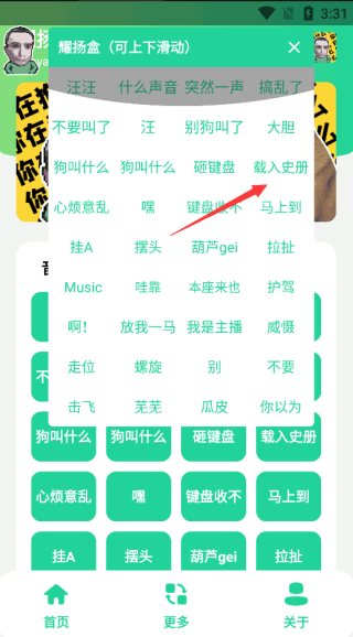 在本平台完成耀扬盒的安装操作后,进入应用主界面就能看到各类语音分类的功能按钮。选择“音效区域”内的对应按钮,系统会立即触发语音播放,这类语音资源可灵活适配聊天互动、休闲娱乐、游戏开黑等多元场景。