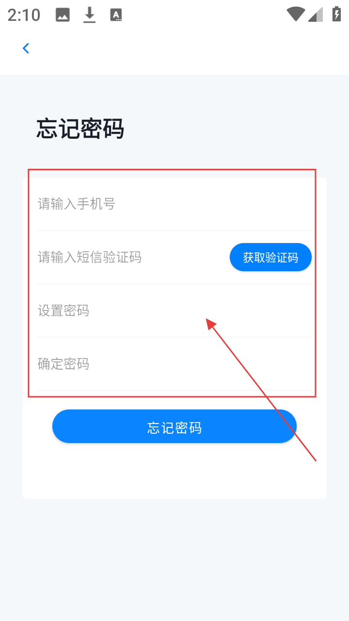 3、在忘记密码页面输入【手机号、验证码与新密码】。