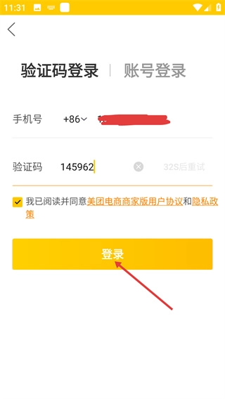 4、在验证码登录页输入验证码后,点击黄色【登录】按钮,完成美团电商商家版的账号登录。