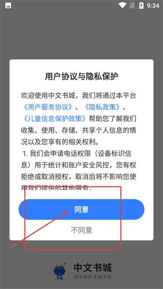 1、首次使用【中文书城】,需点击【同意】按钮,确认用户协议与隐私保护相关内容,方可进入。