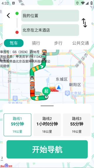 进入具体导航页面后,可选择驾车、骑行、步行、公共交通等多种出行方式,随后查看具体路线并开启导航。