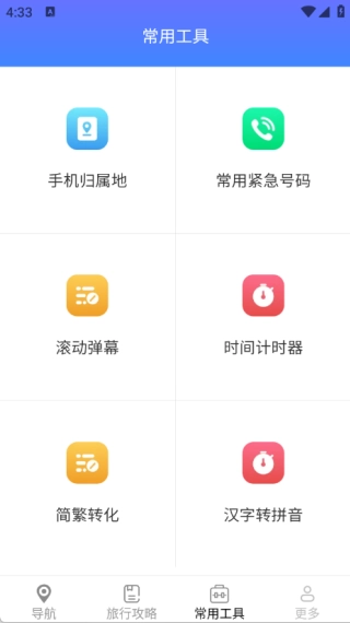 4、常用工具页面包含手机归属地查询、常用紧急号码、滚动弹幕和时间计时器等功能。
