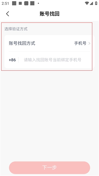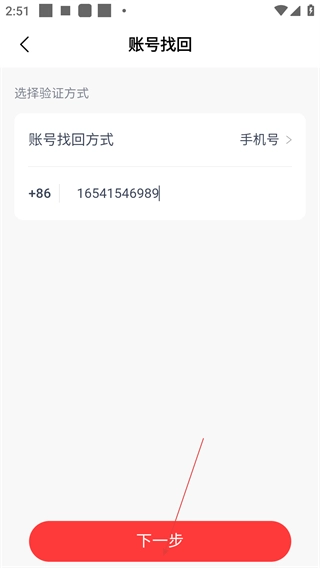 4、在填写好需要绑定的手机号后,点击页面底部的【下一步】按钮,就能继续进行账号找回的后续验证环节了。