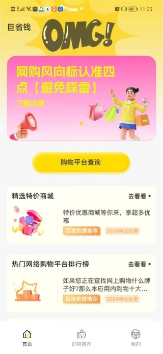 1、首页支持购物平台查询功能,用户可在此了解精选特价商城信息,同时还能查看热门网络购物平台的排行榜。