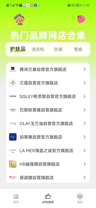 4、在好物推荐页面中可以了解各类护肤品、洗衣机、空调以及零食的网店信息。