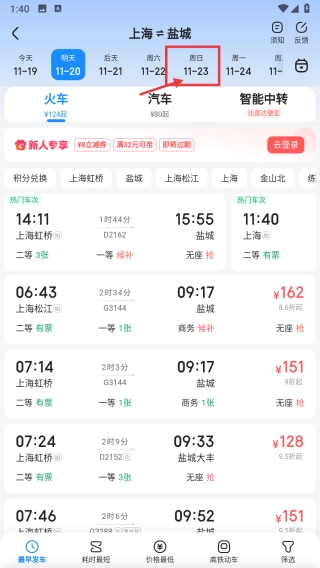 2、在车次查询页面,选择11月23日周日日期标签,筛选当日车次。