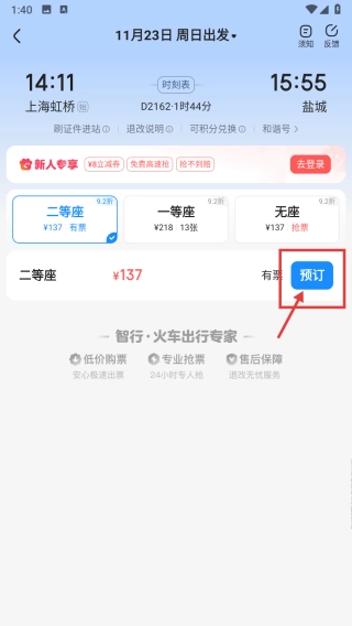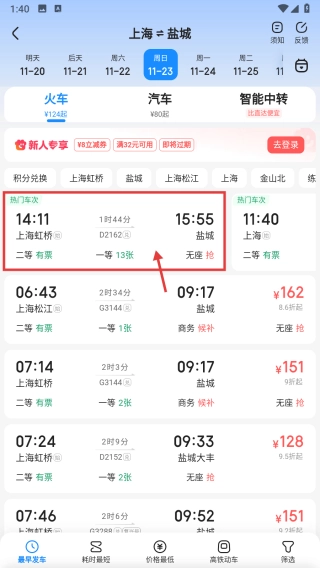 3、在当日车次列表里,点击14:11上海虹桥到盐城的车次条目,进入车票预订页。