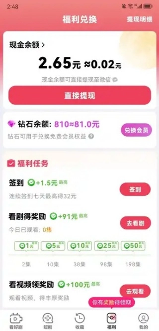 3、在福利页面中可以进行各类福利兑换,还可以进行了解福利任务;
