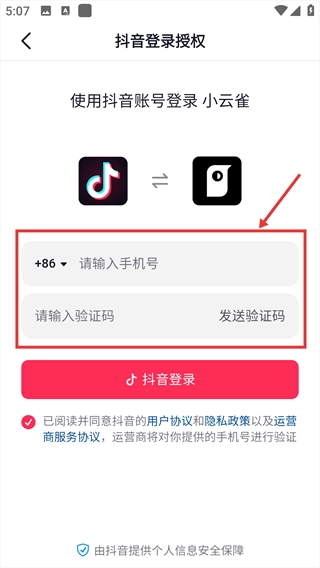 3、在【抖音登录授权】界面,输入手机号和验证码。