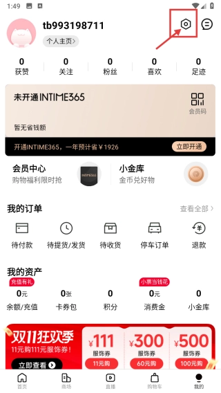 2、在个人中心,点击右上角设置图标,进入设置界面。
