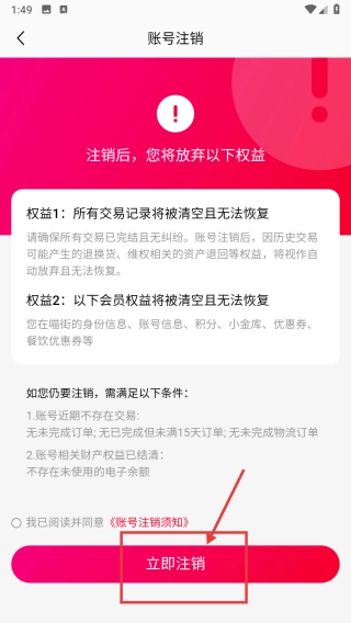4、在注销说明页面,勾选协议后点击立即注销按钮,完成账号注销操作。
