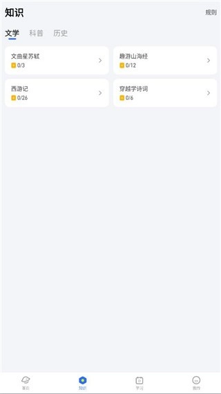 3、点击知识一栏还有关于文学、科普、历史相关的知识可以提前了解