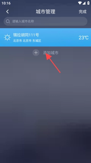 2、点击左上角【+】图标,打开城市管理页面,点击【添加城市】按钮。