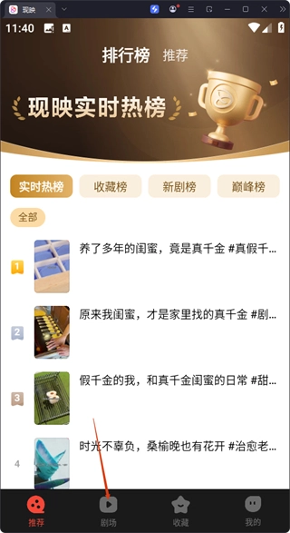 1、在推荐页面,点击底部【剧场】选项,可进入精选内容页面。