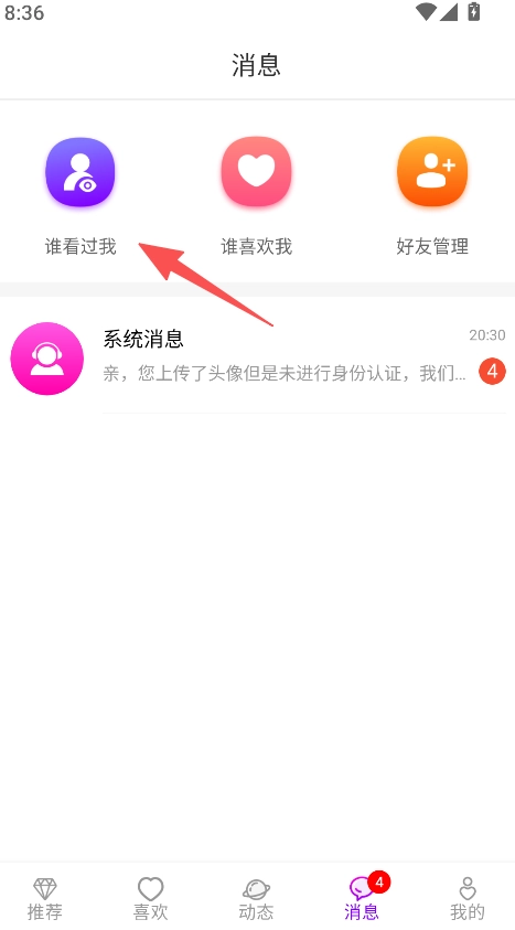 3、进入消息页,可查看谁看过我、谁喜欢我,还能处理系统消息与好友互动。