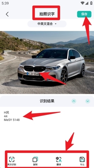 进入拍照识字页面后,可拍摄或导入图片,系统会自动识别其中的文字内容,并且支持一键翻译、复制文字,或是将识别结果导出为文档。