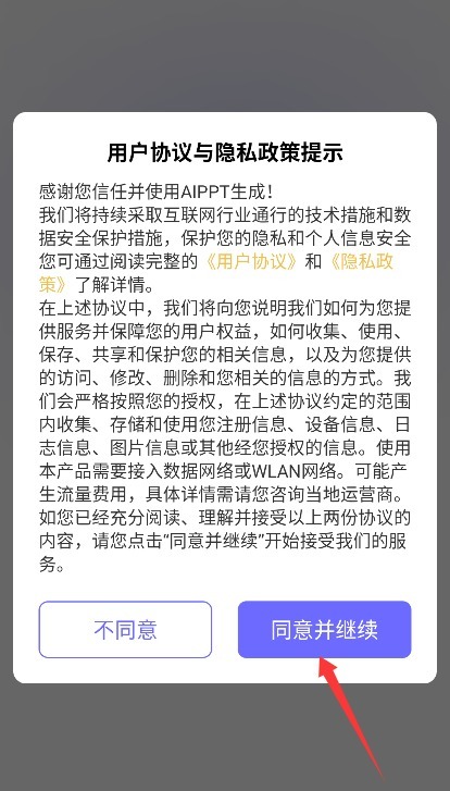 1、初次使用需完整阅读平台服务条款与隐私政策,确认后点击同意并继续进入应用。